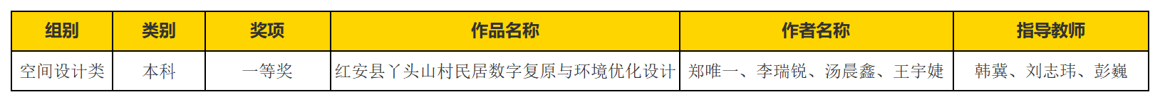 近日,第19届中国好创意暨全国数字艺术设计大赛公布获奖名单,我院报送的师生参赛作品在本次大赛中荣获奖项21项!其中郑唯一、李瑞锐、汤晨鑫、王宇婕同学完成的作品《红安县丫头山村民居数字复原与环境优化设计》荣获国赛一等奖,学生作品获省赛一等奖3项、二等奖1项、三等奖5项;教师作品获常规赛道一等奖1项、二等奖8项、三等奖3项。