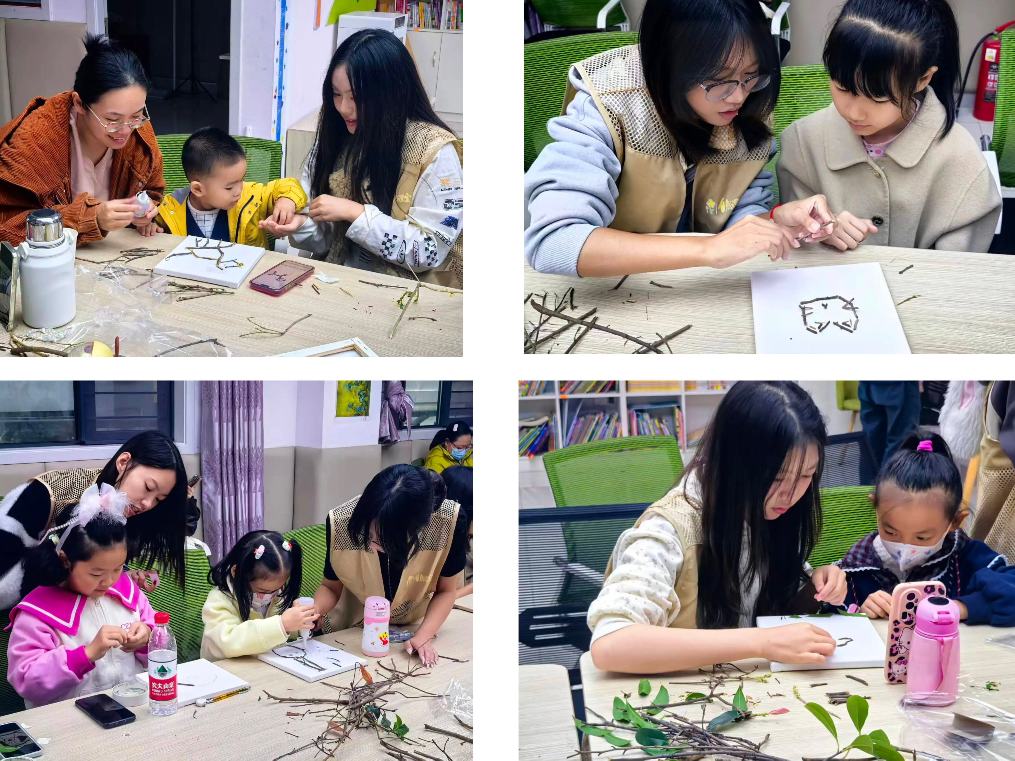 紧接着,激动人心的树枝拼贴环节正式开启。志愿者们分工协作,将收集好的树枝、胶水、彩纸等材料逐一分发给孩子们。在双方志愿者与家长的共同帮助下,孩子们化身“自然艺术家”,用稚嫩的小手摆弄树枝创作:有的孩子拼出活蹦乱跳的小兔子,几根树枝巧妙组合,搭配彩纸做的耳朵,形象活灵活现;有的孩子拼出展翅的小鸟,细细的树枝拼成翅膀形状,仿佛下一秒就要飞向蓝天……树枝在孩子们手中仿佛有了生命,被童心与创意赋予新模样。制作过程中,大家互相分享找到的特别树枝,交流拼贴小技巧,现场充满欢声笑语,每一个角落都洋溢着童真与秋意的交融之美。