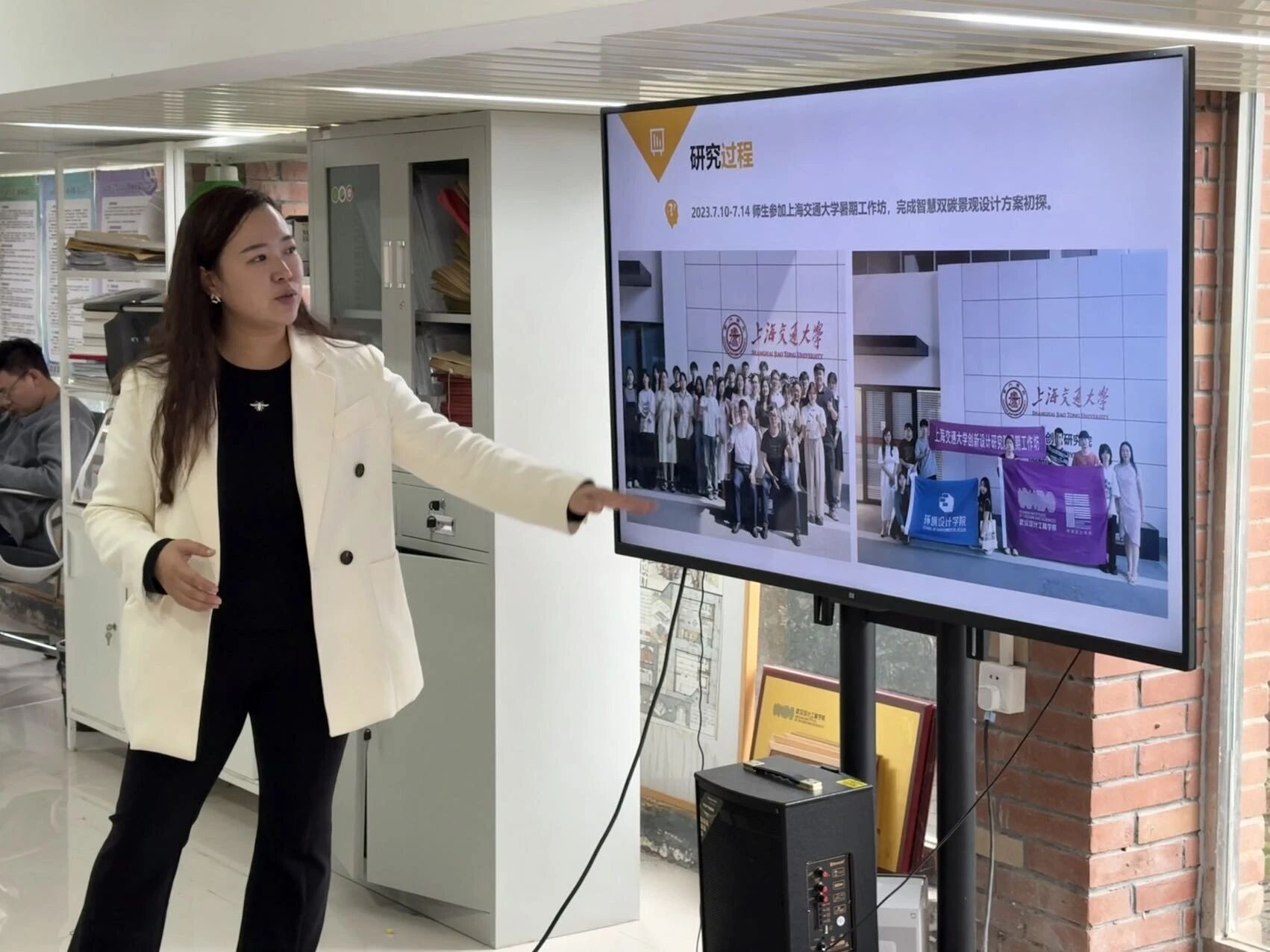 易丹萍老师以自己带领的“云境·智慧双碳”项目为例,结合设计方案与实景图片,生动阐释了“双碳”理念如何落地。从碳达峰、碳中和的概念解析,到上海交通大学暑期工作坊的方案雏形,再到 7747 ㎡场地的精准改造——遮阳设施降低 47%阳光直射,植被优化提升 20%绿化覆盖率,一系列具体数据让同学们真切感受到环境设计与低碳目标之间的紧密联系。
