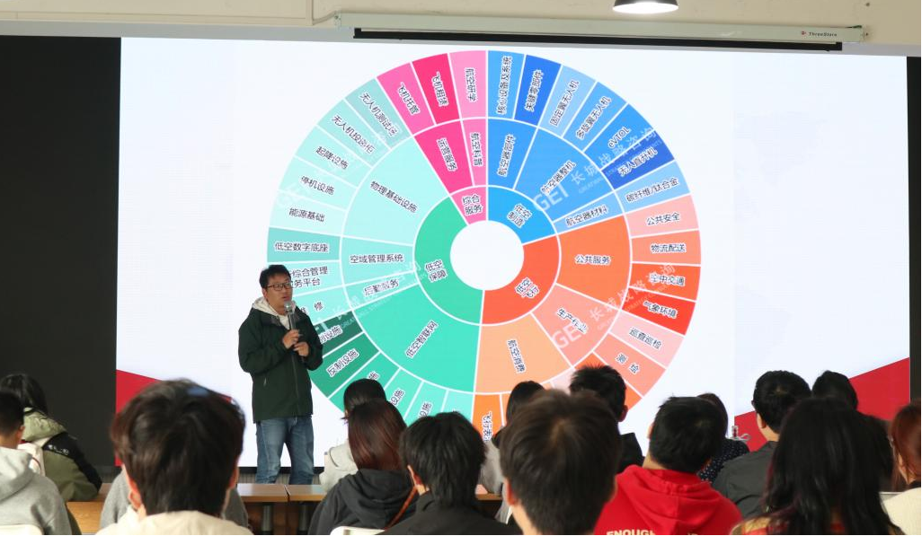 焦阳老师现任武昌理工学院创新创业学院副教授、武汉理工大学校外硕士生导师,拥有丰富的投资与人力资源行业背景。讲座伊始,他便指出,千米以下空域的经济活动正迎来爆发期,无人机是其核心载体。从林区捡松塔、湖泊巡查、农业喷药,到医疗运输、工程检测,无人机已渗透20多个行业,高效解决高危、低效难题。