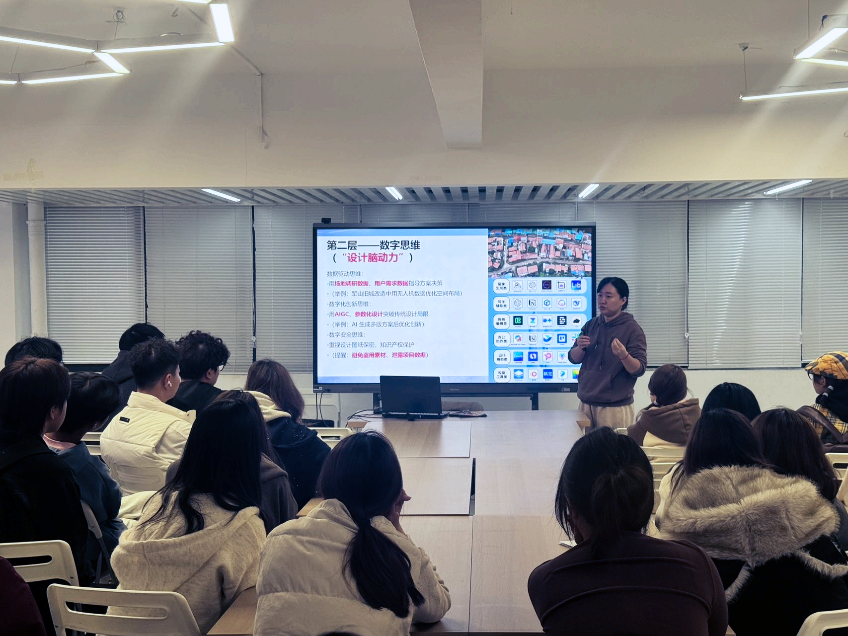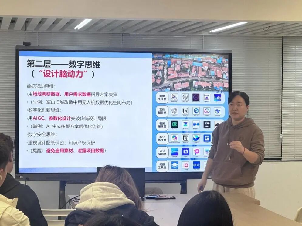 谢玉洁老师以“数字素养的三重维度”为主线,结合环境设计行业的前沿趋势与学生实际,系统阐述了数字思维、数字应用能力与数字社会责任之间的内在联系。她从当前设计岗位需求数据切入,指出室内设计师、景观设计师、UI设计师等职位对数字化工具的普遍要求,并进一步强调:“掌握Photoshop、CAD、SketchUp、Lumion等软件只是起点,真正的竞争力在于运用系统思维分析场地、运用空间逻辑组织方案、运用审美素养提升表达。”