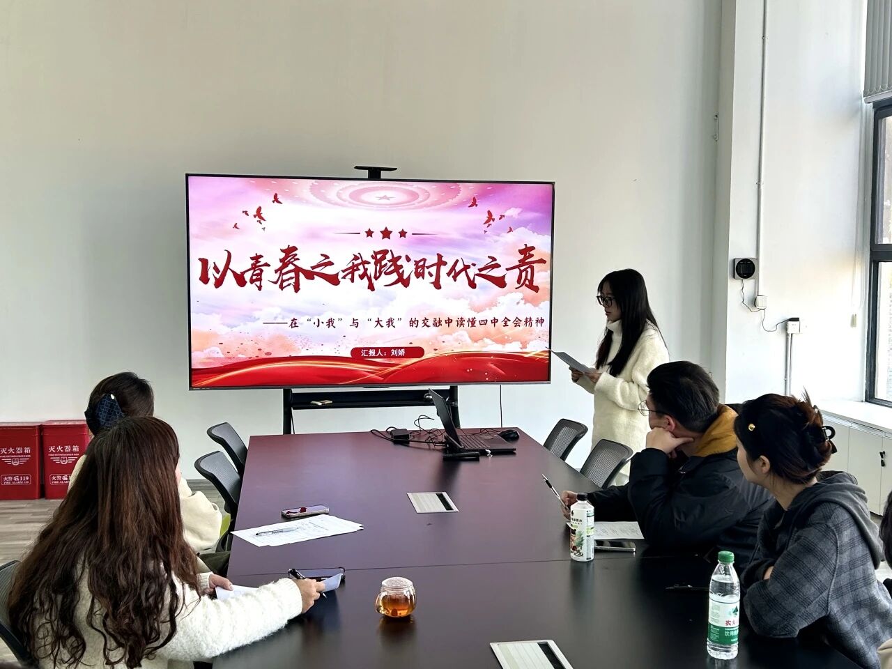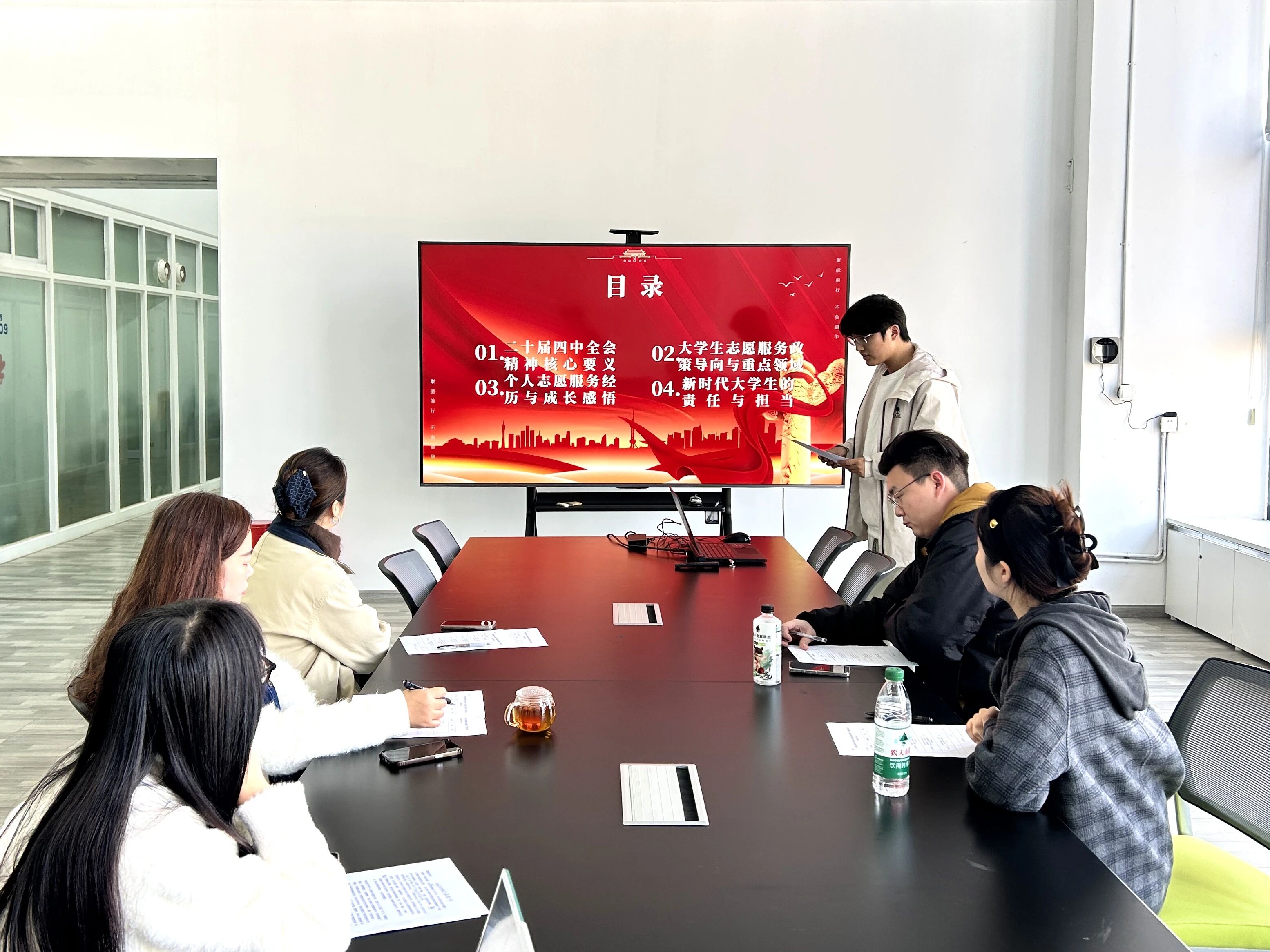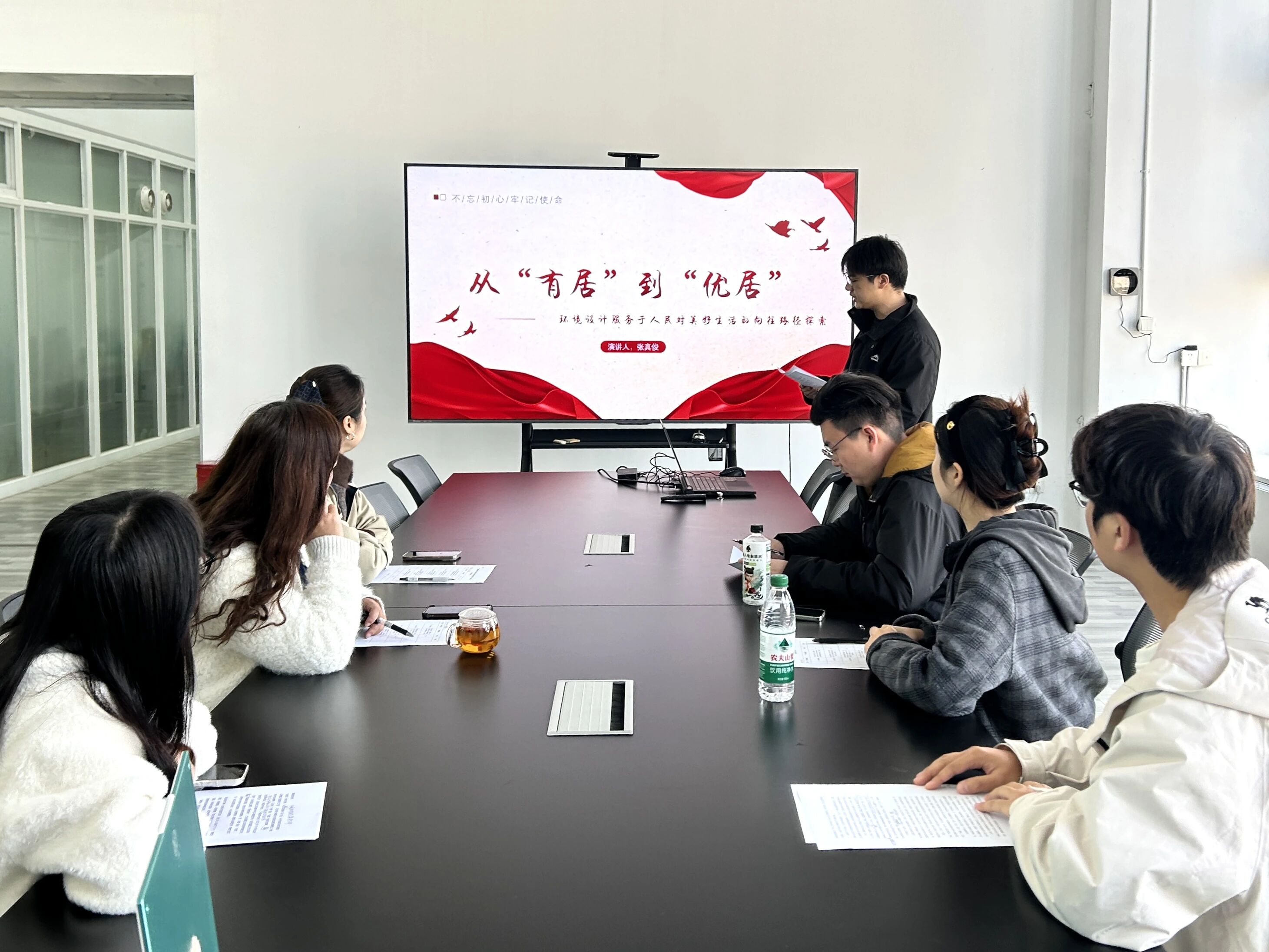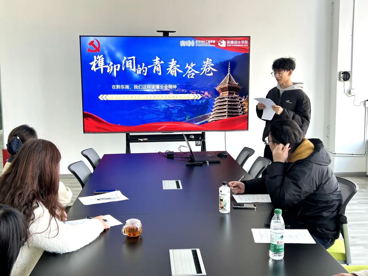 本次比赛旨在选拔优秀宣讲人才,鼓励学生围绕四中全会核心要义,结合专业特色与青年视角进行创新阐释。初赛中,四位由学院党支部推荐的学生预备党员依次登台,展现了理论学习和专业思考的深度结合:周建坤同学以《黔东南传统建筑文化传承与乡村振兴的青年实践》为题,探讨文化遗产保护与乡村振兴的青春路径;许皓同学在《以志愿微光映时代征程》中,结合志愿服务经历,诠释青年责任与时代使命;刘娇(同学通过《以青春之我践时代之责》,讲述如何在“小我”与“大我”的交融中践行全会精神;张真俊同学立足专业,分享《从“有居”到“优居”:环境设计服务于人民对美好生活的向往路径探索》。选手们借助PPT、案例叙述等形式,将宏观政策与设计实践、个人成长与社会发展紧密联系,展现了环境设计学子扎根现实、胸怀家国的理论素养与青春担当。