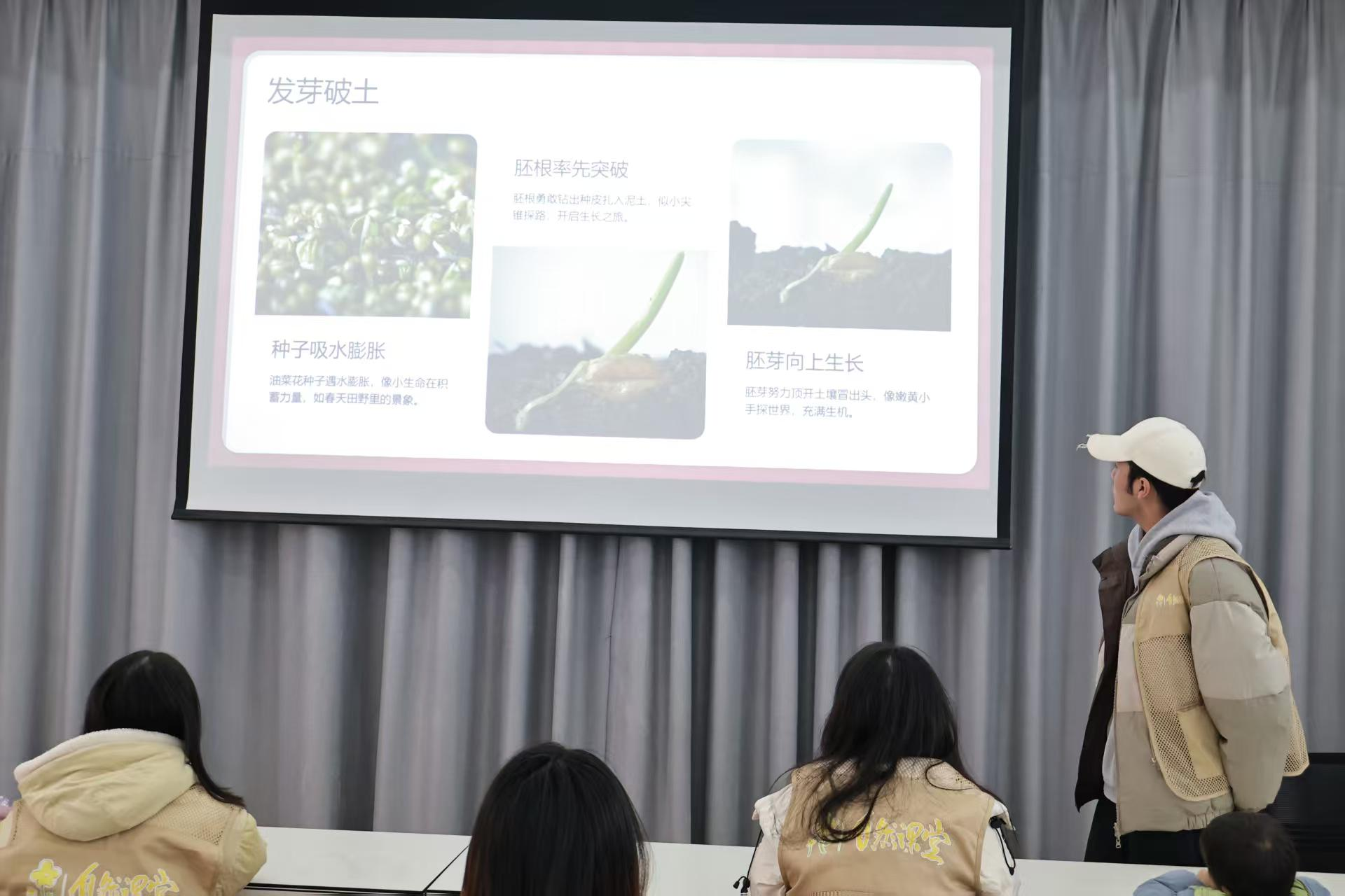 在孩子们的好奇中,志愿者化身“植物故事家”,用卡通动画和趣味讲解,展开了油菜花的生长画卷:“一颗黑亮亮的油菜籽,躺在泥土里喝饱水、晒够太阳,就会冒出嫩黄的芽尖;慢慢长出绿叶,抽出花茎,最后在春风里开出金色的小花;花谢之后,还会结出细细的豆荚,里面又藏着新的油菜籽,开始新的生命循环。”为了让孩子们更直观理解,志愿者还拿出提前准备的生长阶段图片,带着孩子们一一对应,“原来油菜花要长这么久才开花呀!”孩子们边听边点头,小脑袋里装满了新奇的知识。
