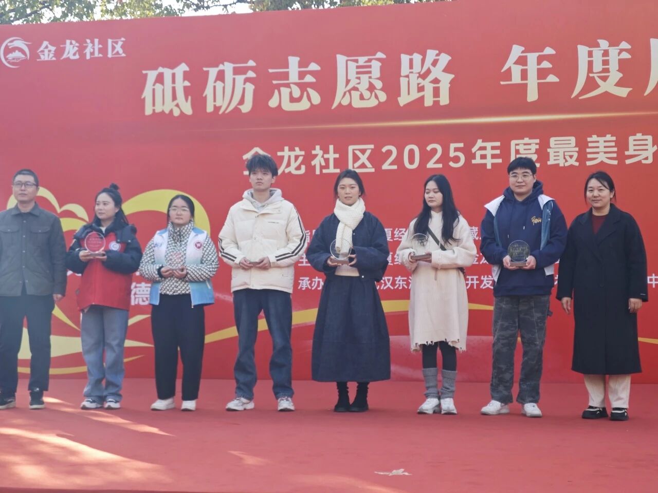 近日,武汉市江夏经济技术开发区金龙社区2025年度“最美身边人”表彰大会顺利举办。环境设计学院 “筑梦” 志愿服务队凭借扎实的服务成效与突出的奉献表现,再度荣获 “最美高校志愿服务队” 荣誉称号。这是社区对团队坚守志愿初心、深耕基层服务的高度认可,也为学院全体志愿者持续投身公益事业注入了强劲动力。