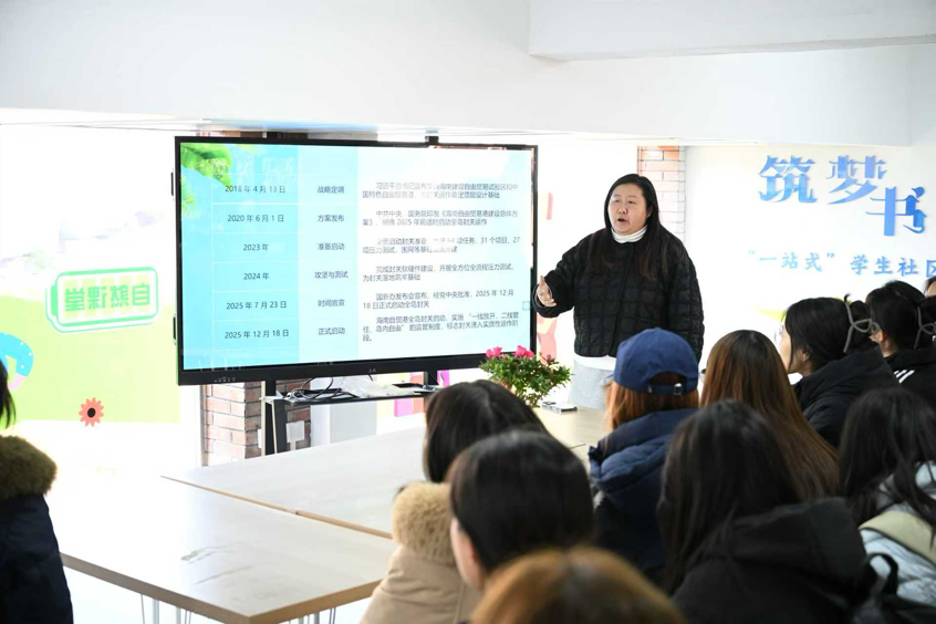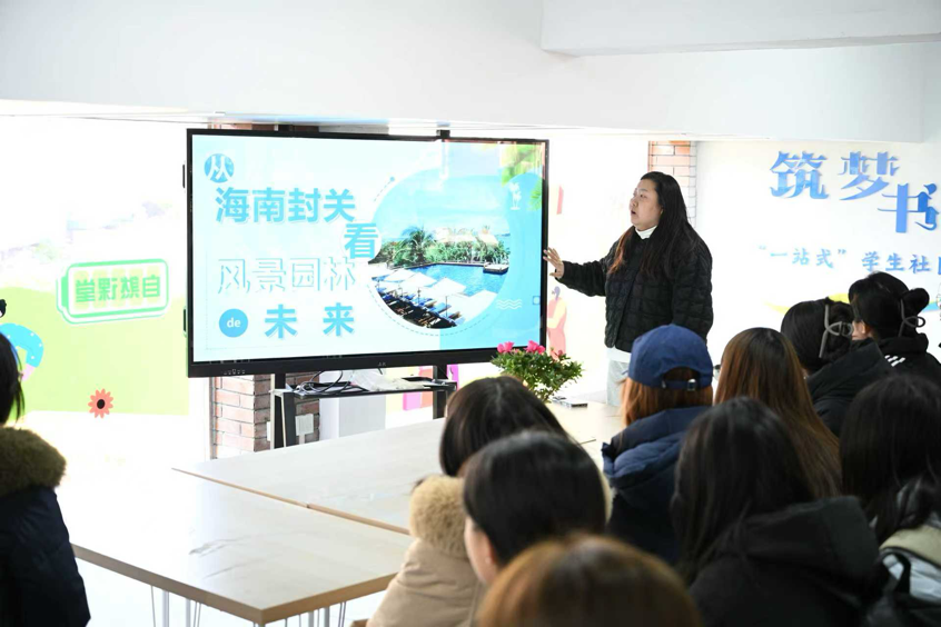 本网讯(通讯员:孙韵皓 陈冠宇 殷志惠)2025年12月25日,环境设计学院第四十三期“听班主任说”师生分享会在筑梦书苑一站式学生社区顺利举行。本期主讲班主任曾艳老师围绕“从海南封关看风景园林的未来”这一主题,引导同学们从专业角度理解当下国家发展趋向对于风景园林专业的影响,思考个人发展与国家发展的关系。