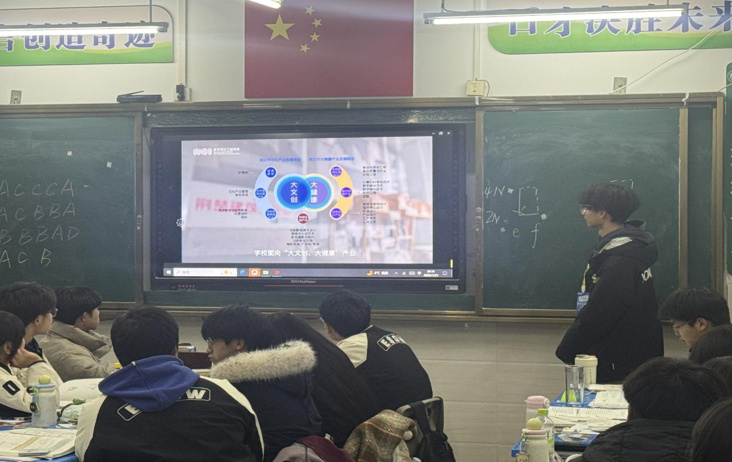 当日下午,宣讲在热烈期待中正式开始。伴随武设校园宣传片的播放,汤逊湖畔的粼粼波光、现代的教学设施、丰富多彩的校园活动与创意十足的学生设计作品,瞬间抓住了在场学子的目光,引发阵阵赞叹。“从高三的日夜拼搏到武设的自由探索,这一路成长离不开母校的培养,也庆幸自己选择了对的方向。”实践队队长以自身经历切入,深情讲述在武设参与设计竞赛、社团活动与志愿服务的点滴,以真实故事向学弟学妹传递:大学是探索自我、突破边界、实现成长的广阔舞台。