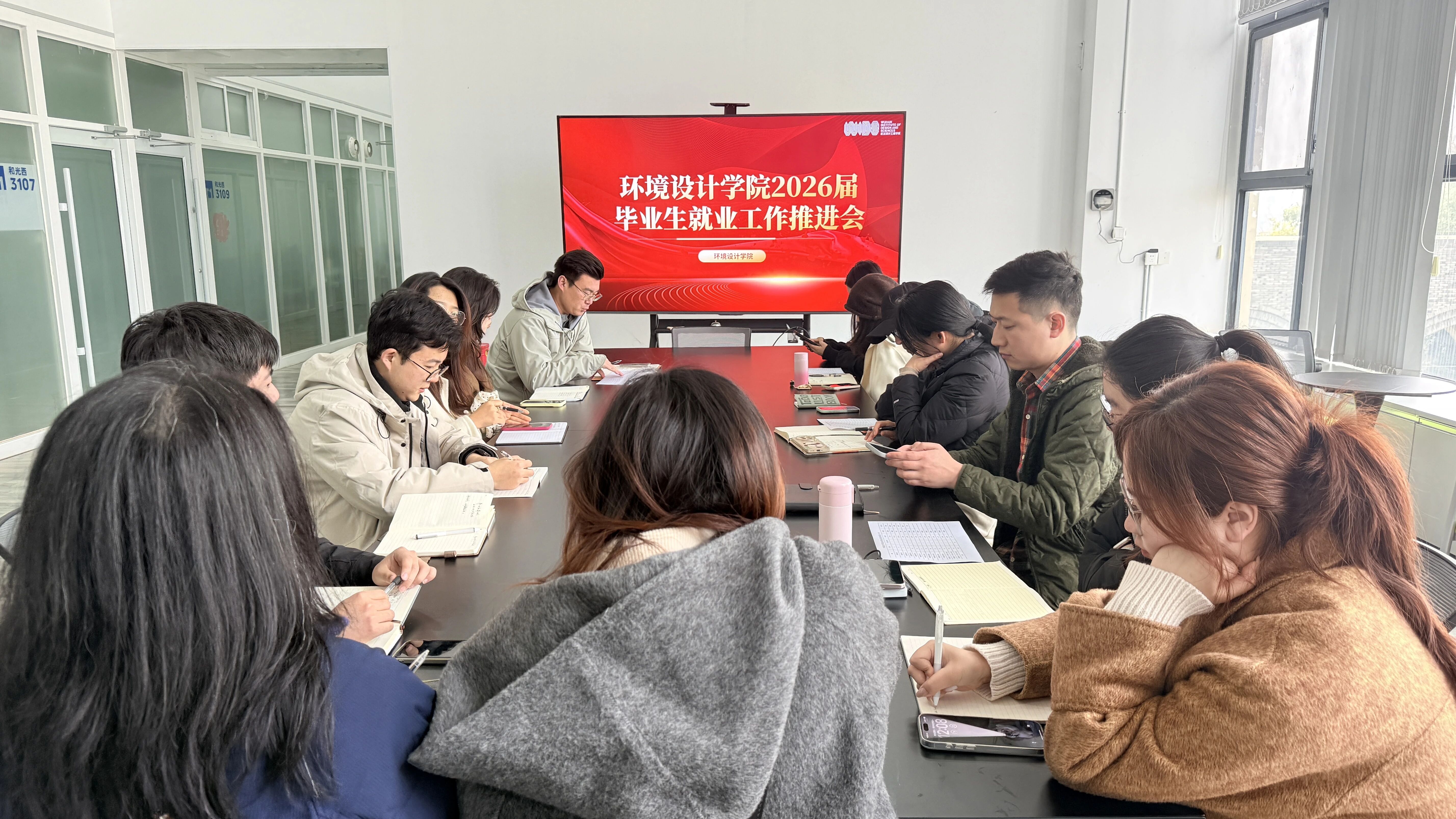 为深入推进 2026 届毕业生就业工作,切实提升就业工作质量,3 月 9 日中午 12 点,环境设计学院于和光三楼中庭组织召开本学期2026届毕业生第一次就业工作推进会。会议由学院党总支副书记黄俊杰主持,全体毕业班辅导员及班主任参加会议。