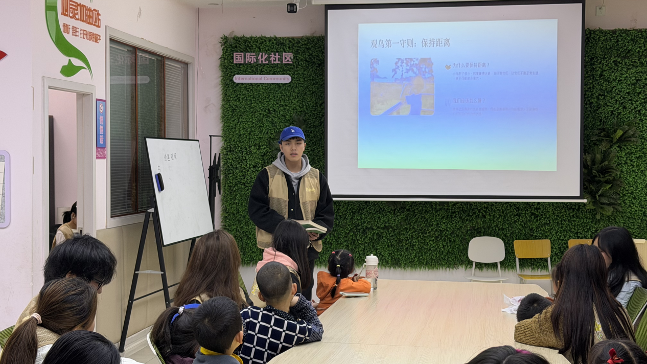 PPT 页面不断切换,志愿者用通俗的语言讲解鸟类知识:从越冬归来的雁群到啄虫筑巢的啄木鸟,从啼鸣的黄鹂到衔泥安家的家燕。“啄木鸟的嘴巴像坚硬的凿子,是大树的‘私人医生’!” 志愿者指着图片模仿啄树声,孩子们纷纷跟着学,活动室里满是清脆的 “咚咚” 声。当讲到部分鸟类因栖息地破坏、环境污染难以安家时,孩子们表情变得严肃。“我们能为小鸟做什么?” 小男孩皱着眉追问。志愿者温柔回应:“不打扰筑巢、不丢垃圾、在阳台放清水和谷物,都是帮小鸟安家的好方法!” 孩子们认真点头记下。