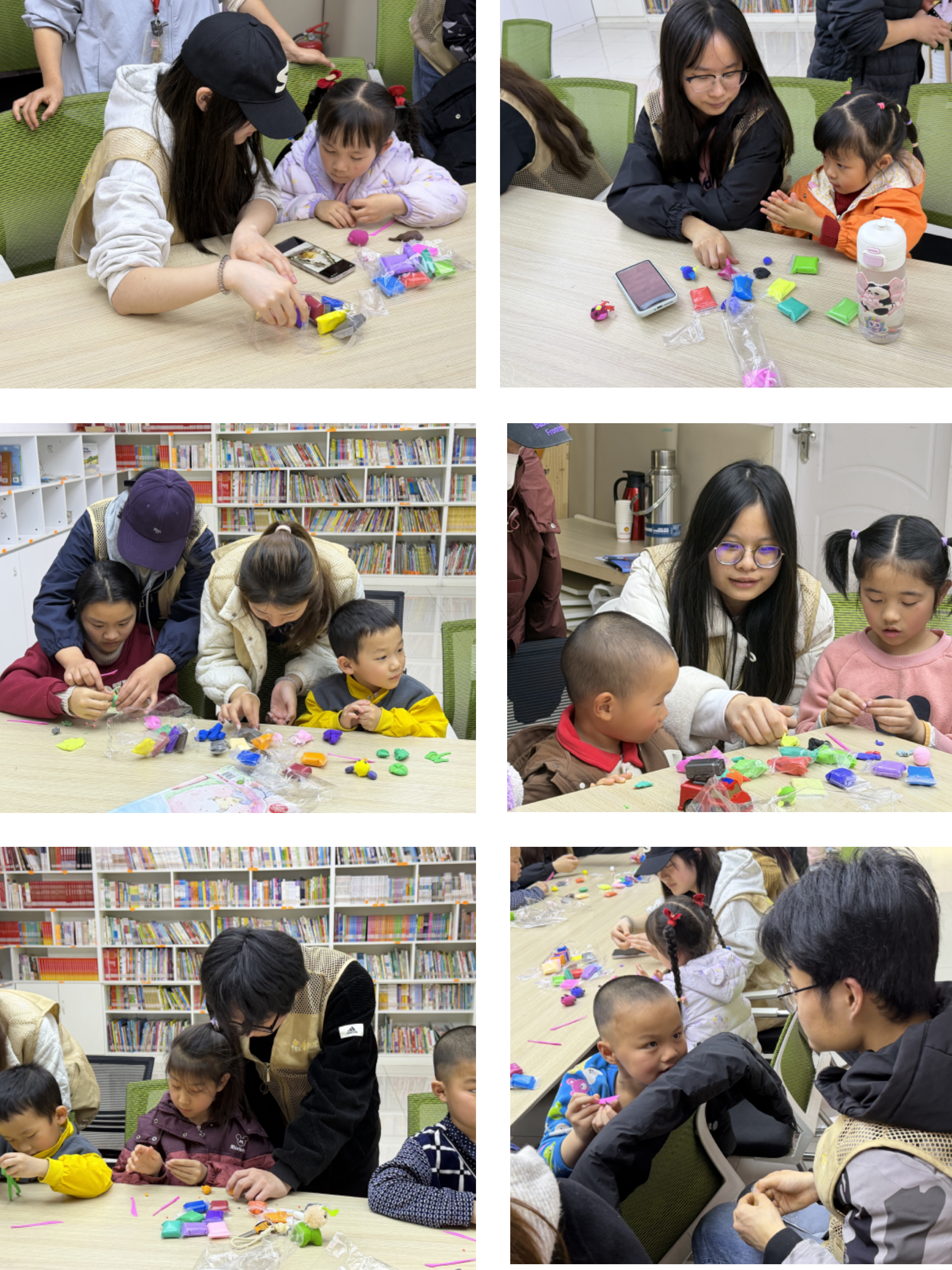 科普结束后,粘土小鸟制作环节正式开始。志愿者将红、黄、蓝、绿等各色粘土整齐分发,指尖沾着碎屑耐心讲解:“先揉圆形做身体,再捏翅膀、脑袋和尖嘴巴,最后可刻出眼睛和羽毛纹路哦!” 孩子们立刻兴致勃勃动手,活动室里响起轻柔的揉捏声与欢快讨论声。 有的用灰褐色粘土做麻雀,念叨着 “要像迎春花旁看到的那样圆滚滚”;有的搭配粉绿粘土创作 “迎春小鸟”,给尾巴缀上 “嫩芽”;还有的专注雕琢细节,用黑色粘土做眼睛,在翅膀压出细密纹路。孩子们互相递粘土、调姿态,偶尔为 “嘴巴尖圆” 争论几句,笑声伴着粘土清香,温暖了整个活动室。